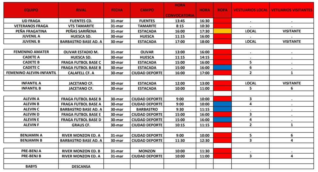UncategorizedHorarios fútbol base marzo 27, 2019abril 3, 2019 Unión Deportiva Fraga Calendario de competición fútbol base, para los días 30 y 31 de marzo: Comparte esto: Haz clic para compartir en X (Se abre en una ventana nueva) X Haz clic para compartir en Facebook (Se abre en una ventana nueva) Facebook Me gusta Cargando... Relacionado